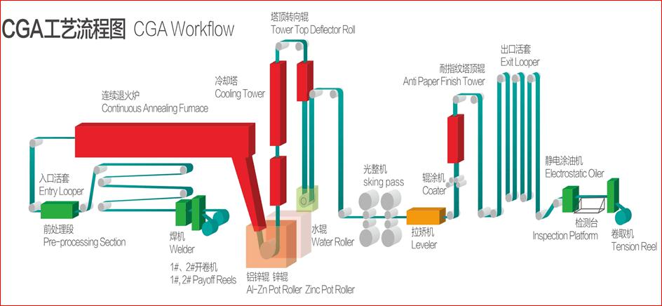 鍍55%鋁鋅鋼卷之鋁鋅合金結構是由55%鋁、43.4%鋅與1.6%硅-在600℃高溫下固化而組成,其整個結構由鋁-鐵-硅-鋅,形成致密的四元結晶體,此結晶體在鋼板上形成一層屏障,因而有效的防止腐蝕因子穿透。